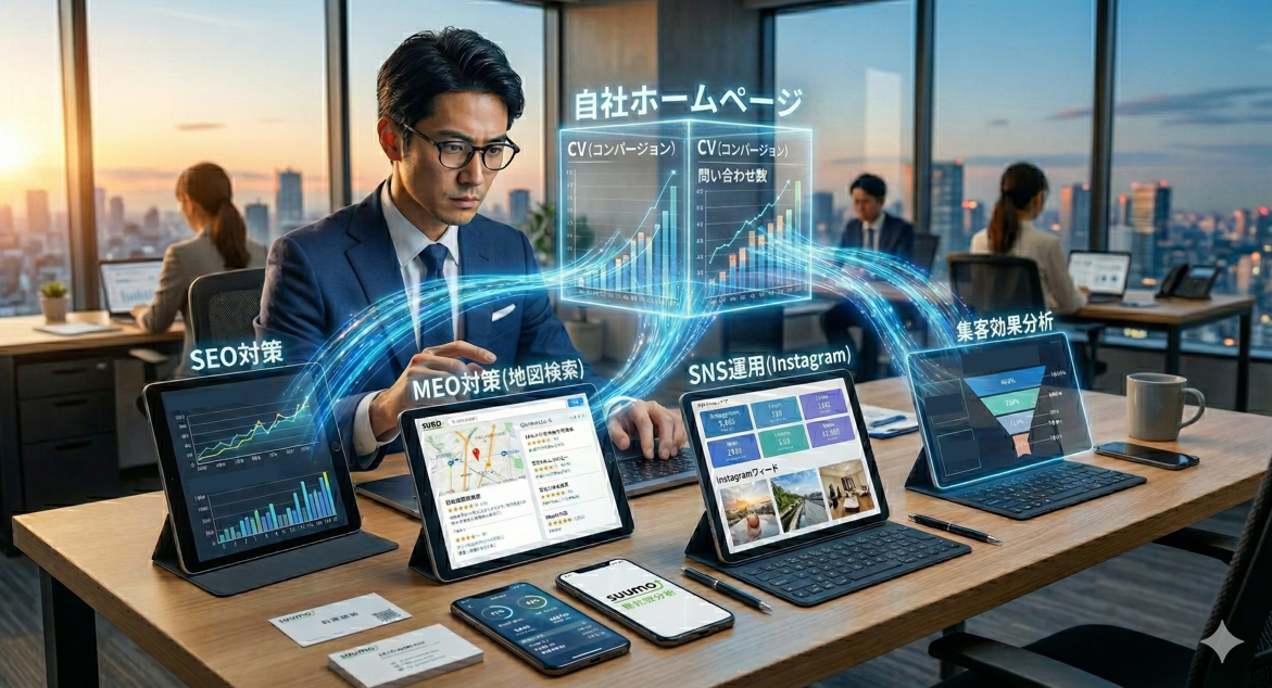 不動産会社のホームページ集客は、物件を探すユーザーとの最初の接点として非常に重要な役割を担っています。インターネットで情報収集を行うことが当たり前となった現代では、自社サイトの検索順位や使いやすさが問い合わせ数を大きく左右します。本記事では、不動産ホームページ集客の基本から具体的な施策、反響率を高めるためのポイントまで網羅的に解説します。SEO対策やMEO対策、SNS運用など複数のチャネルを組み合わせることで、広告費を抑えながら継続的な集客を実現する方法をお伝えします。